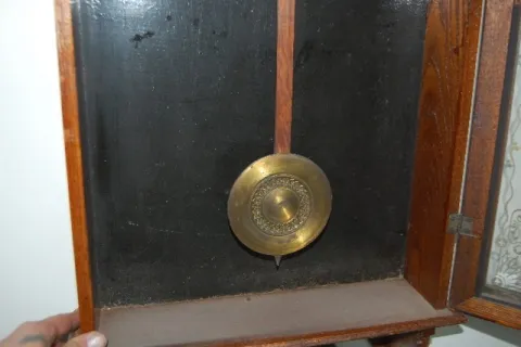 has pendulum; 8 day; T & S; Ingraham paper dial; gilt decorated door. (Case lightly alligatored; discolored dial.) Not tested. 36"...