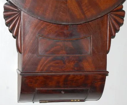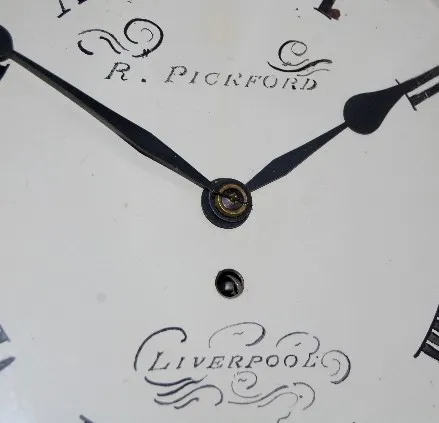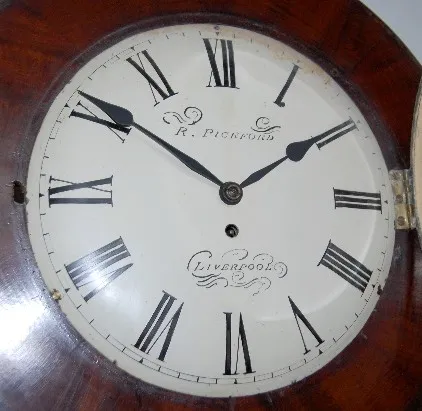 has pendulum; painted metal dial with "R. Pickford, Liverpool" and Roman numerals; TO; mahogany veneer case. (Some veneer and wear damage to the case....