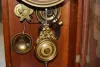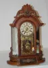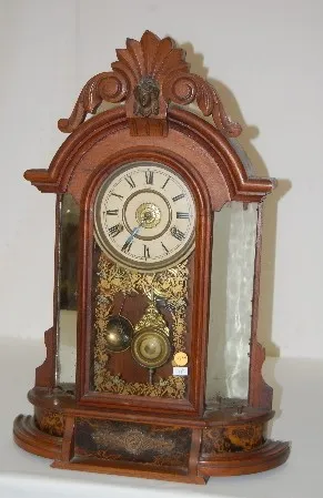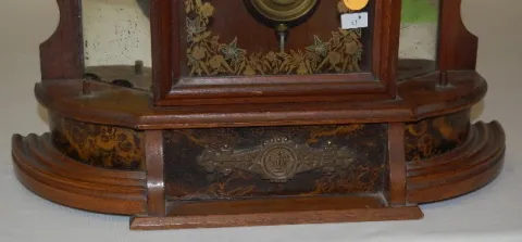 Made in U.S.A. paper dial; T & S with alarm; has pendulum and key; gilt decorated door. (Not running; mirrors are spotty; no side statues.) 24"...