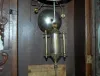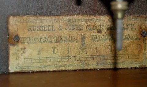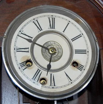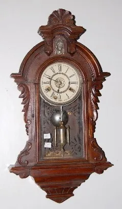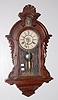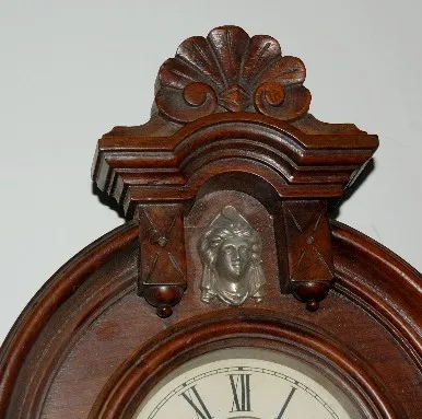 has pendulum; paper dial; T & S with alarm; 3 keyholes; carved case with applied lady head; decorated door; paper label on back and inside. (Dial disc...