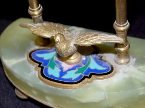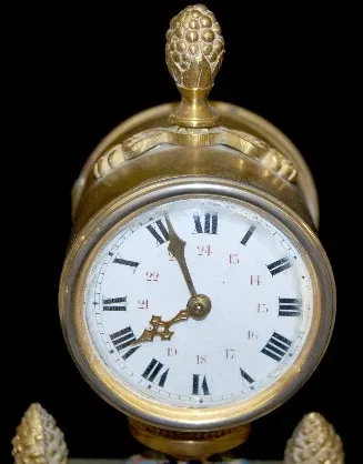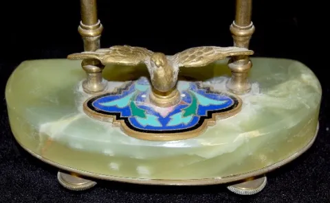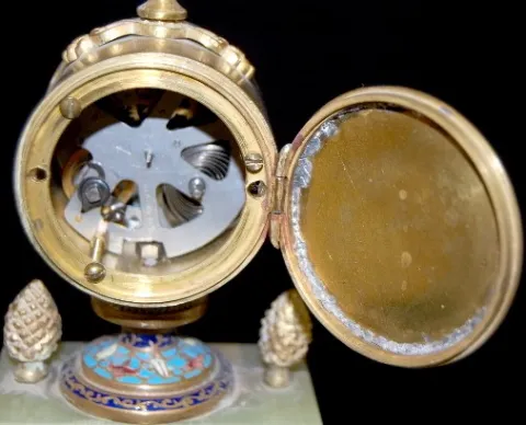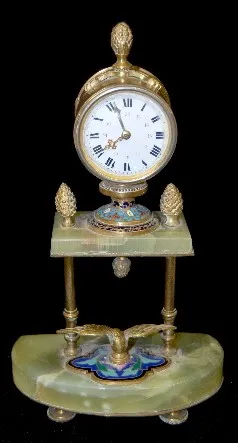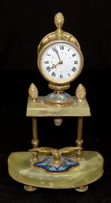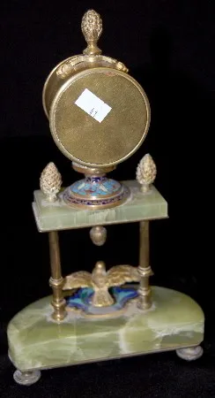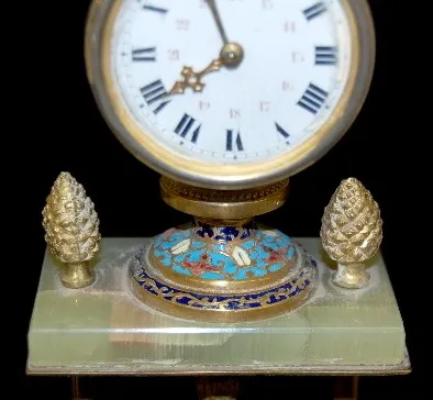 unmarked porcelain dial with black Roman numeral hour markers and red Arabic 24 hour numerals; movement marked N Made in France; has key. Green onyx w...