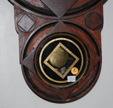 has pendulum; T & S; paper dial; interior label; gilt and black decoration on lower door. (Case has some roughness; dial badly stained and worn.) Not ...