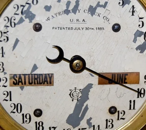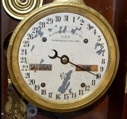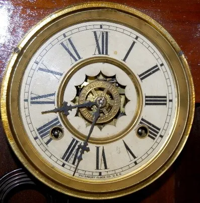 8 day time with half hour gong strike on a cup bell striking alarm; original dials. The clock is running and striking at this time. (The dials are los...