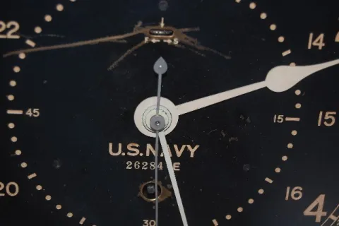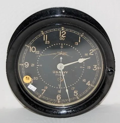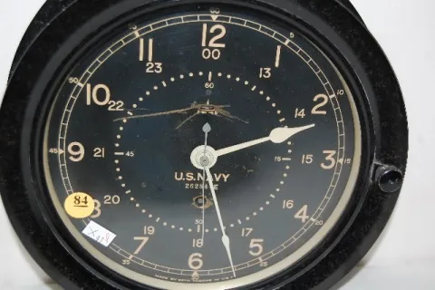made of a hard black plastic like substance; it has a black 8" 24 hour Military dial and TO movement; marked No. 26284-E. (The dial is scuffed up by t...