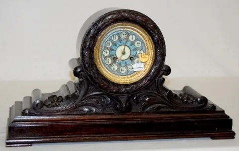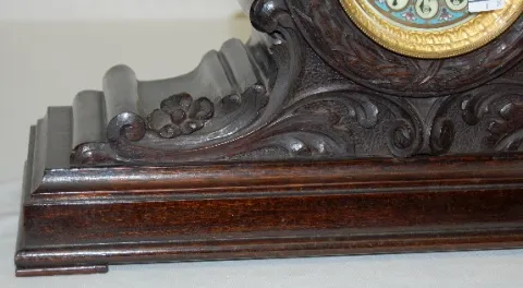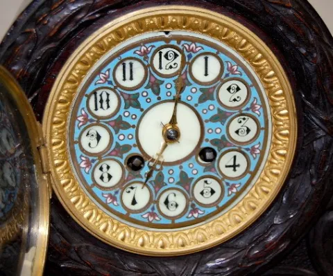 has pendulum; Champlev enamel chapter ring over a porcelain dial; brass movement marked France A1, Marti, 1204 4 4; beveled glass door; carved case. ...