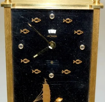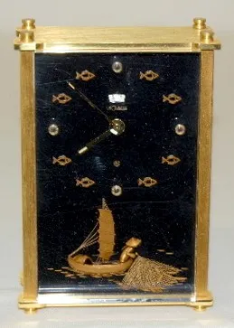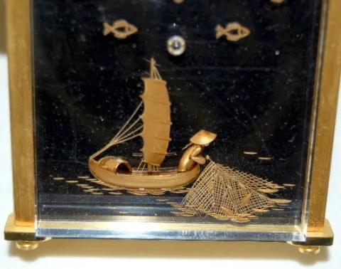 clock with Oriental fishing scene; 8 day; seconds dial; fish as hour marker. (Not running.) 5 1/4"...