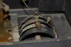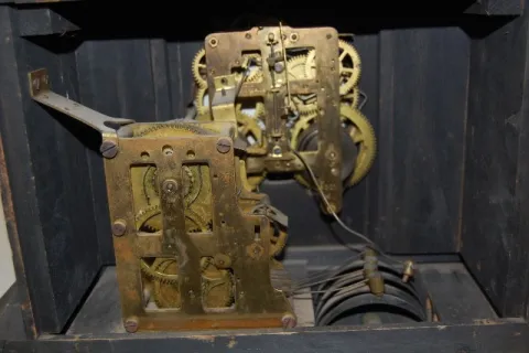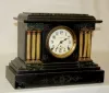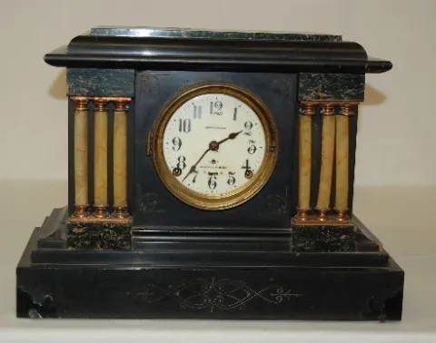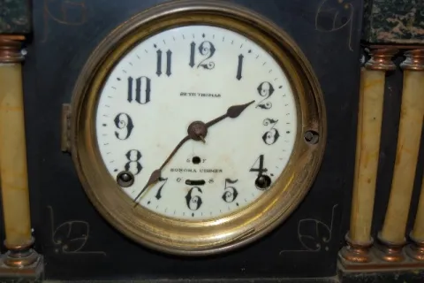 marked Seth Thomas Sonora Chime celluloid dial; 4 bell strike; T & S; has pendulum; green adamantine enameled wood case with faux marble columns. Not ...