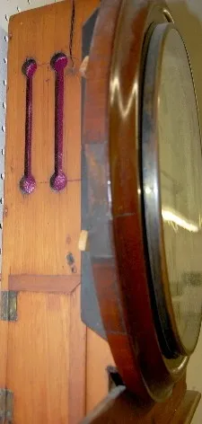 has pendulum; TO; bell strike; painted porcelain dial. (Originality of case not known; all parts look old but may have been married in the past; case ...