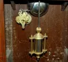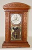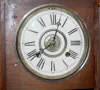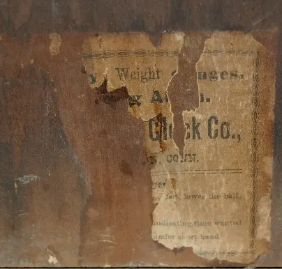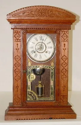 has pendulum and key; paper dial on a nickel plated dial base marked Pat'd Feb. 11, 1879; one day strike with alarm; 2 weights; door decorated with gi...