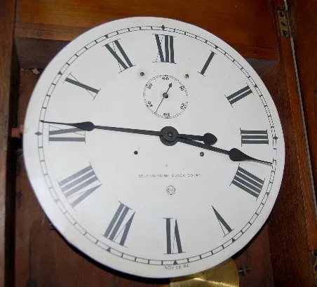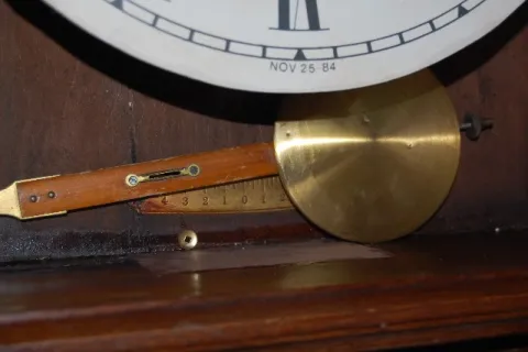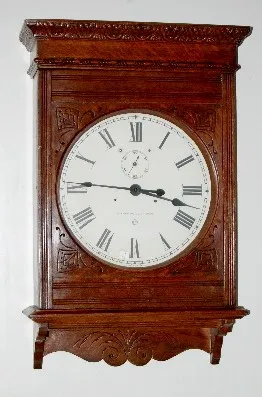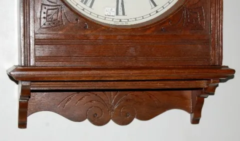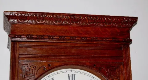 marked cardboard dial; seconds bit; has pendulum; carved oak case. Not tested. 14 1/2" Dial; Case 32" x 20"...