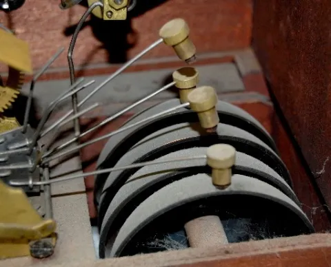 unmarked silver metal dial; 2 key holes; 4 bell; brass marked movement. (No key or pendulum; dial scratched; bezel does not latch; dial is loose; slig...