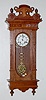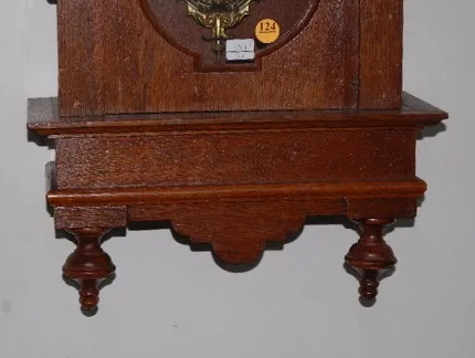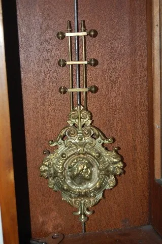 142520; porcelain dial; ornate, embossed man head pendulum; has key; nicely carved oak case with applied decoration. (Minor veneer damage; cracks in d...