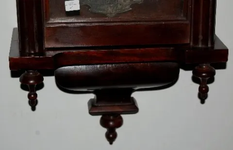 has pendulum; Ansonia paper dial; 8 day; time and spring; 8" dial; mahogany finish case. (Dial yellowed.) Not tested. 54"...