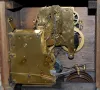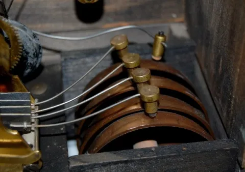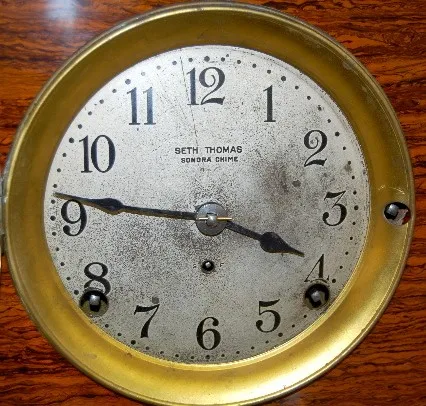 has pendulum; Seth Thomas Sonora Chime marked silver colored dial; 4 bell strike; 3 key holes; brass movement marked Made in U.S.A. 89M; red adamantin...