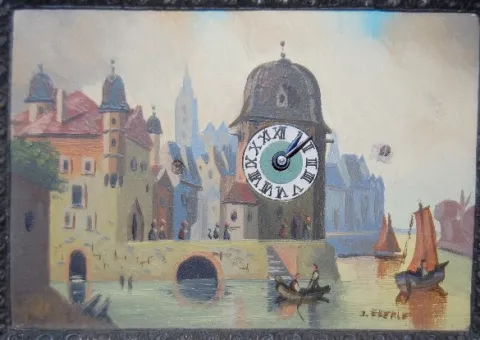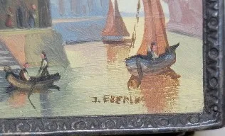 miniature oil painting of a Venetian water scene with Venetian gondolas and sail boats with an old city in the background with a large clock tower. Ea...