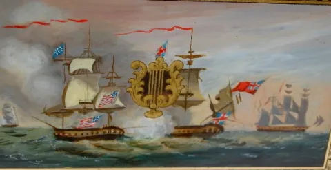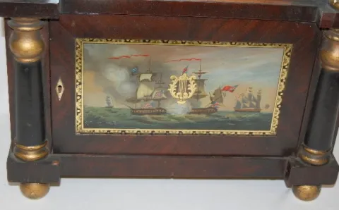 wood dial; gilt gesso flower basket top; American/British battle scene tablet. (Center mirror cracked.) 36 1/2"...