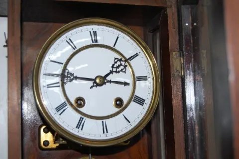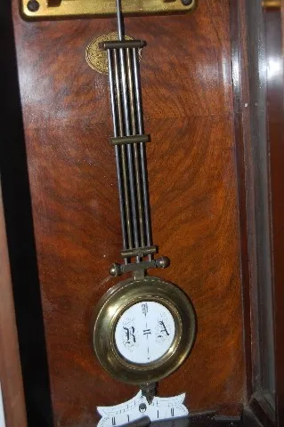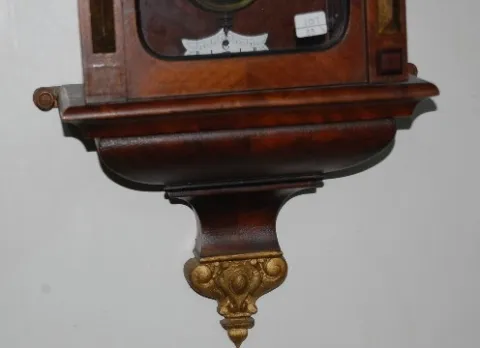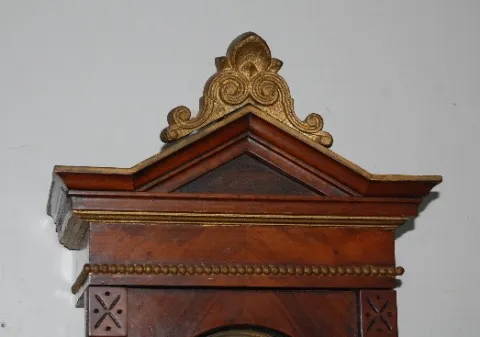 works signed Lenzkirch 343600; porcelain dial; RA pendulum; with key; carved case with gilt top and bottom. (Dial has minor damage; top piece needs re...