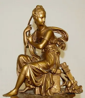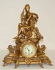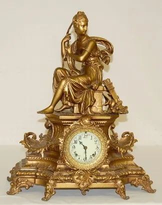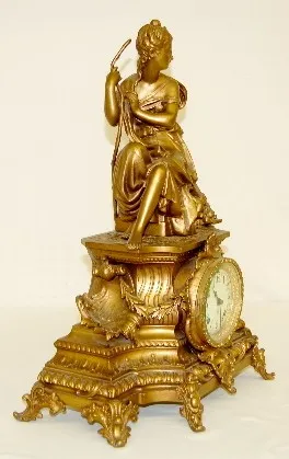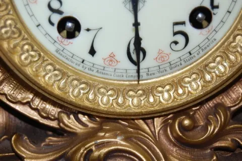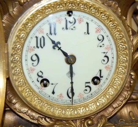 has pendulum; T & S; marked Ansonia decorated porcelain dial; brass movement marked Ansonia. Running and striking at this time.) 21"...