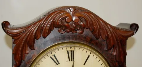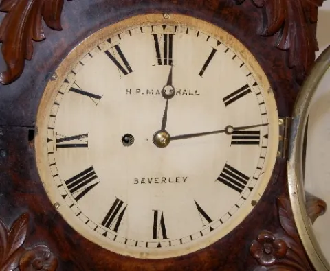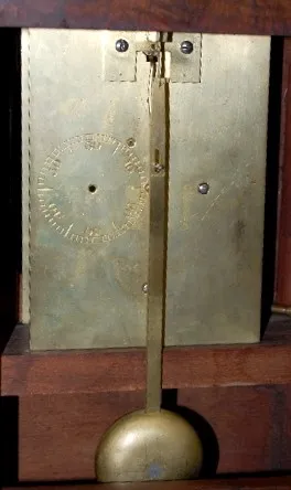 has pendulum and key; painted metal dial with H.P. Marshall, Beverly; Roman numerals; unmarked brass movement; Nice case with door key. (Discolored di...