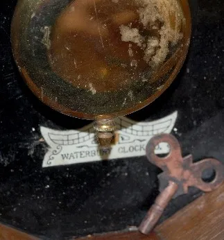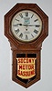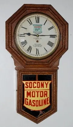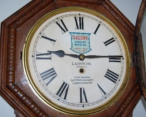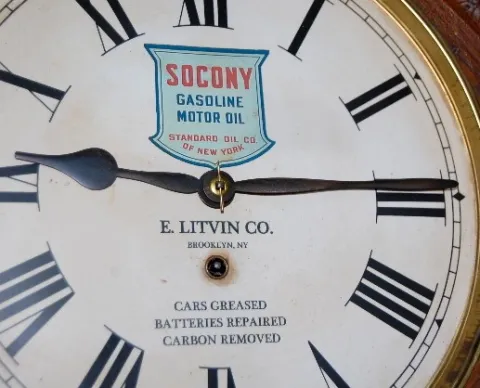 has pendulum and key; 12" paper dial advertising "Socony Gasoline Motor Oil, E. Litvin Co., Cars Greased; Batteries Repaired; Carbon Removal" TO; nice...