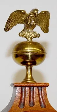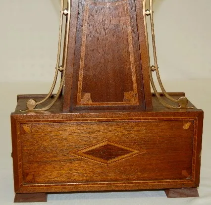 has pendulum; 8 day; spring; half hour strike; gong; porcelain dial; brass movement marked Waterbury; mahogany inlaid case. (Top finial does not match...