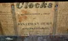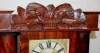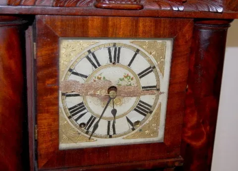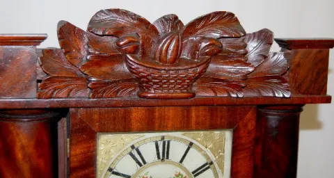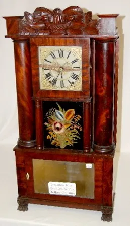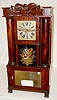 Rare! Floral glass tablet; mirror in lower door. (Teeth broken on wood works; wooden dial has roughness; good label inside.) 35 1/2"...