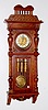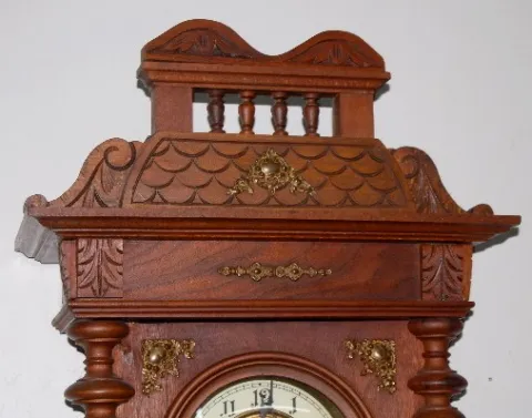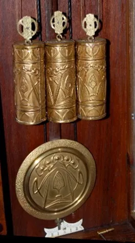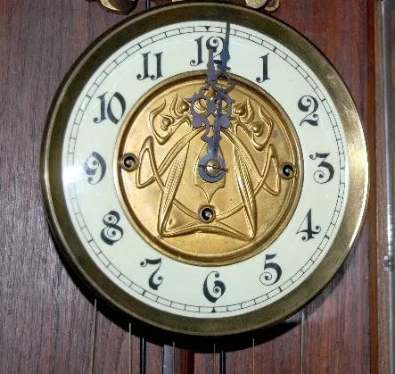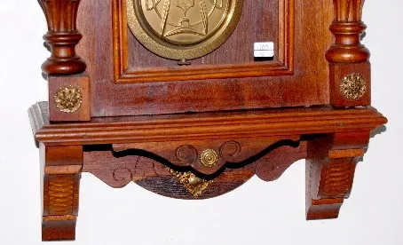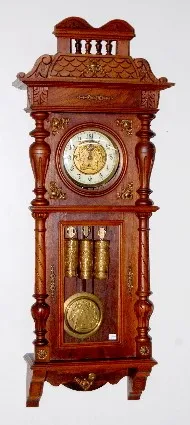 Gustav Becker 610999; engraved weights, porcelain chapter ring dial with engraved center with 3 matching engraved weights and pendulum; has crank styl...