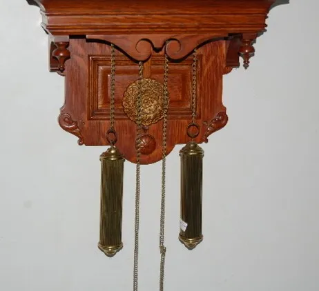 8 day; strike; has pendulum and weights; floral painted dial; nice looking clock. 36" Long not including weights....