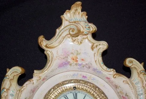 floral rococco case; porcelain dial; T&S; with pendulum and key. Not tested. 19"...