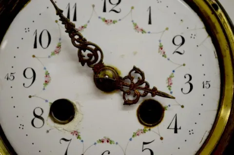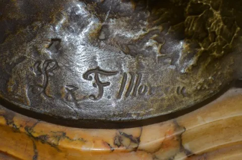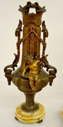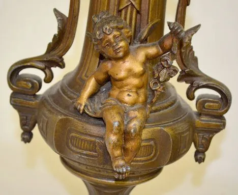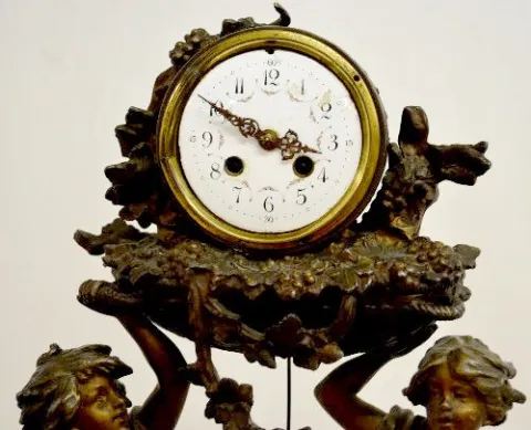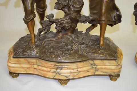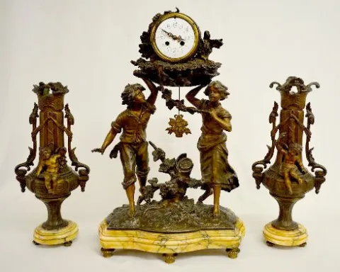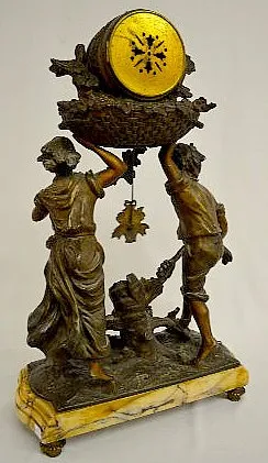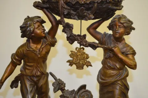 With a T&S movement numbered 6538; an unmarked porcelain dial; and the pendulum. The statue is signed "L & F Moreau" and depicts an young girl and boy...