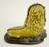 With a TO movement; an unmarked porcelain dial and the key. Made of cast iron mounted on a wooden base. The eyes are animated. The "Patent Applied For...