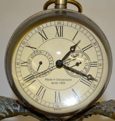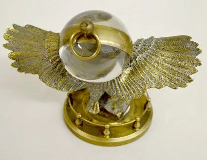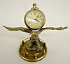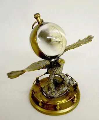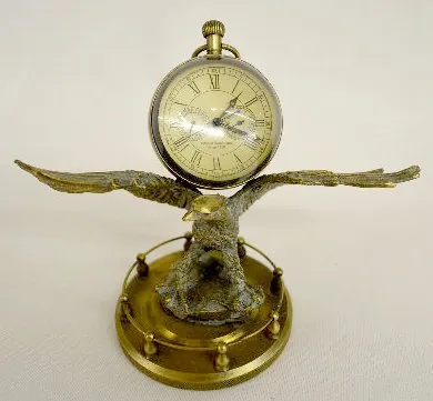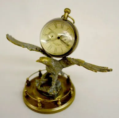 The eagle, with wide spread wings and a ball clock on his back, sits on a brass base. The dial is marked "Made in Switzerland Since 1856". (The clock ...
