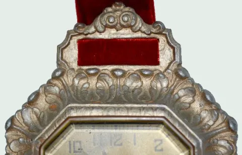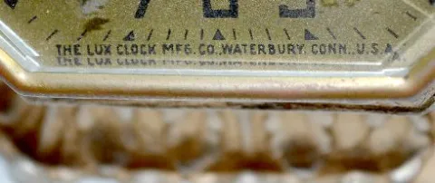 With a set key wind movement; a marked Lux gold paper dial; a DeLuxe label on the back; beveled glass and a red velvet strap. (The clock is not runnin...