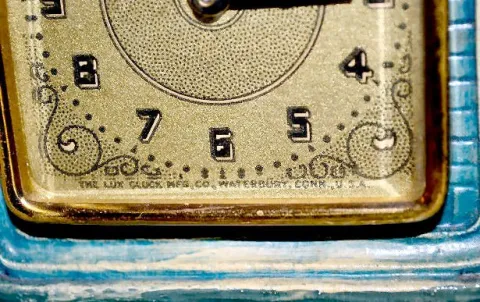 With a set key wind movement; a marked gold paper dial and a DeLuxe label on the back. (The clock is not working.) 10 1/2" Tall...