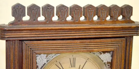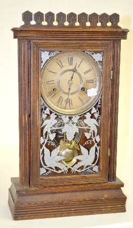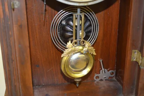 With a one day strike movement and an unmarked paper dial. The door is stenciled with birds and grapes. The key and a round pendulum with leaves are w...