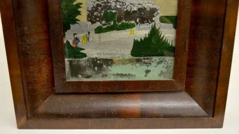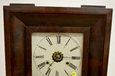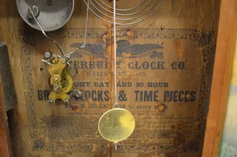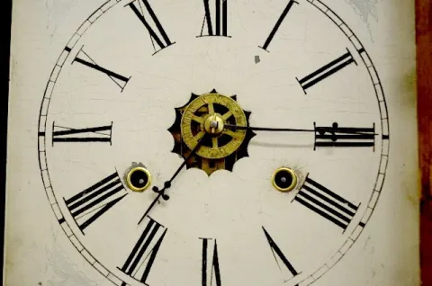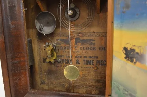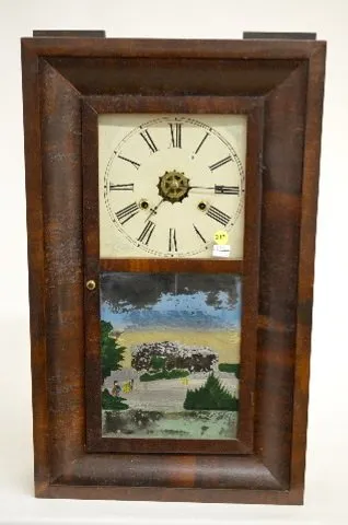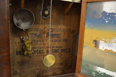 With a T&S and alarm movement; a metal painted dial; 2 weights; the pendulum and key. The case has a painted lower door and an interior label. The clo...