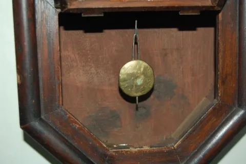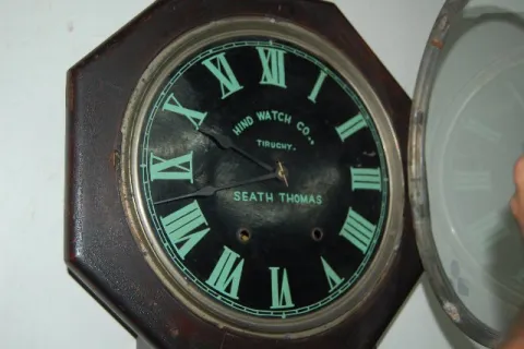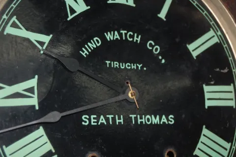 T & S with a marked paper black dial with green numbers; reads Hind Watch Co., TIRUCHY. (India) and Seath Thomas; has weight and pendulum. Not tested....