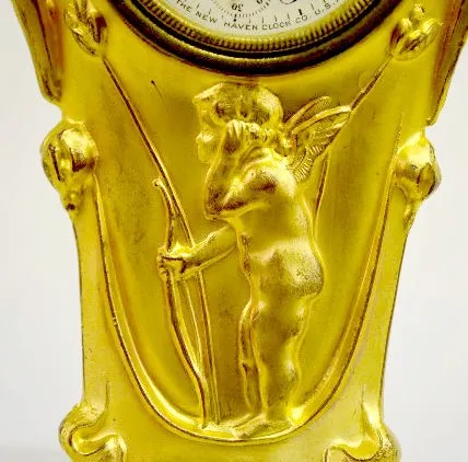 With a set key wind movement with seconds bit; a "New Haven" marked dial; and a Cupid theme. The clock is running at this time. 7 1/8" Tall...