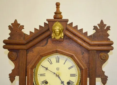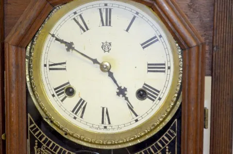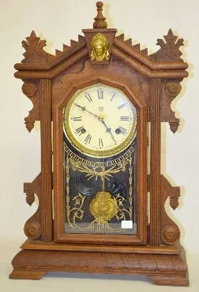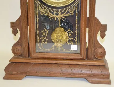 With a T&S movement; a paper dial marked "WCC"; decorated glass door and the pendulum. {C. Adams also used Lovell Mfg. labels.} The clock is running a...