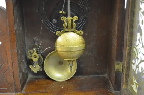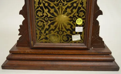 With a T&S movement; an unmarked paper dial; and the pendulum. The black walnut case has a decorated door glass. The clock is running and striking. (T...