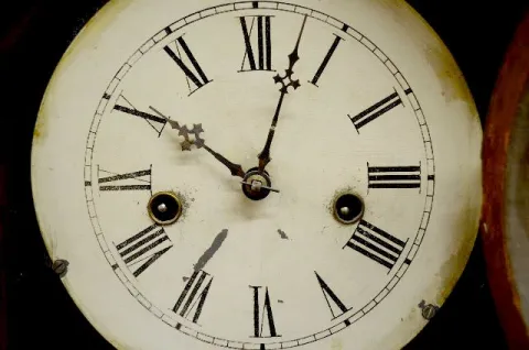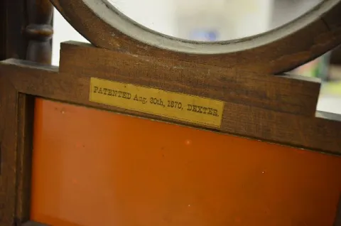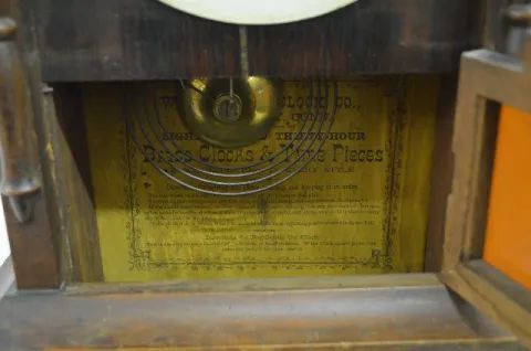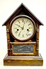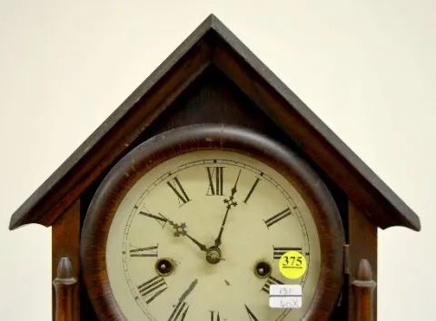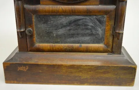 In a walnut veneered case with a T&S movement; an unmarked painted metal dial; a good inside label and a mirrored door. (The clock seems to want to ru...