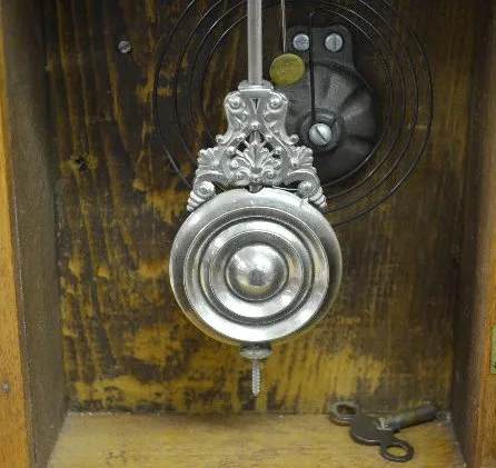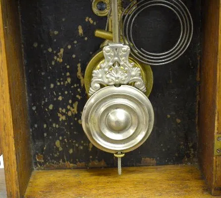 With a T&S movement; a painted metal dial marked "A"; a nickel target pendulum and the key. The oak case has a rear paper label and a decorated glass ...
