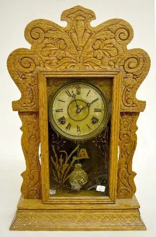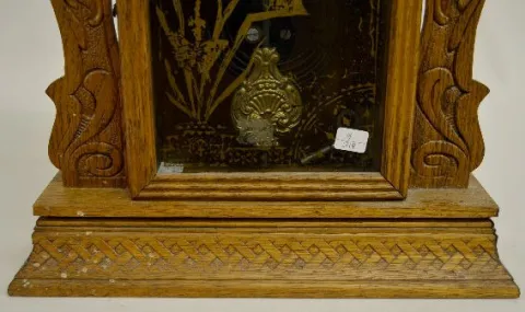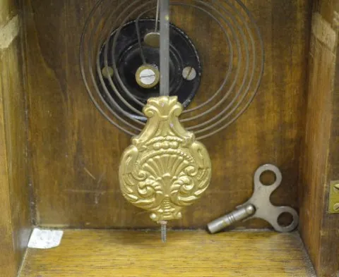 With a T&S movement; an unmarked paper dial; the pendulum and key. The oak case has a paper label on the back and a decorated glass door. (The clock i...