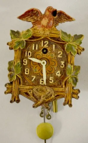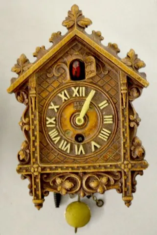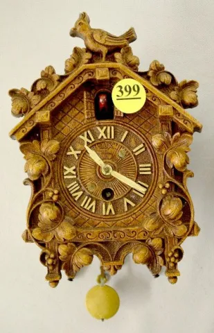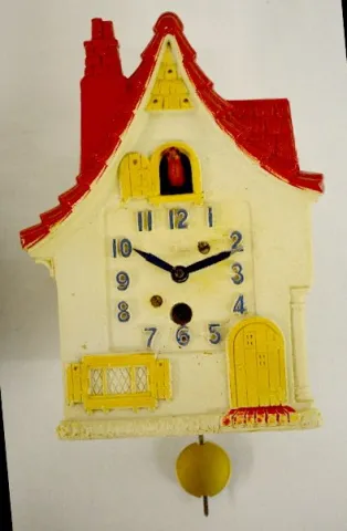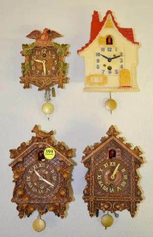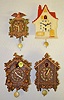 1.) Lux house with red roof, marked and has the pendulum. 2.) Lux cuckoo with leaves; marked and has the pendulum. 3.) Lux cuckoo with bird and leaves...