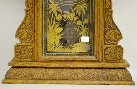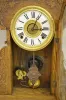 With a T&S with alarm movement; a marked paper dial; a decorated glass door; a paper label on the back and the pendulum. The clock is running and stri...