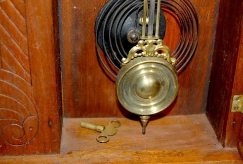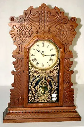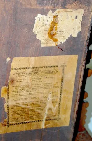 With an 8 day T&S movement; a marked paper dial with brass pan and a nickel pendulum. The door is stenciled with a shell, laurel leaves, a center meda...