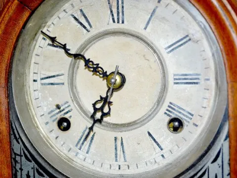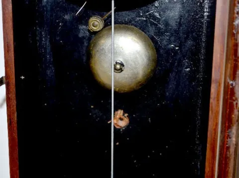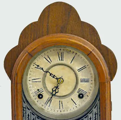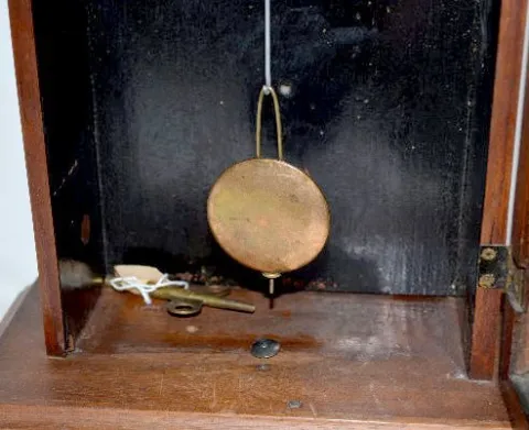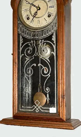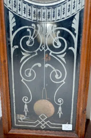 8 day T & S; unmarked dial; has pendulum; marked works but unreadable; owner identified as a Kroeber. Not running. (Stained dial, top crest glued.) 22...