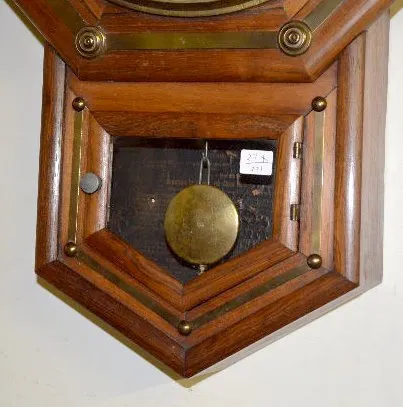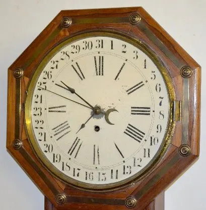 7 day Time, calendar; marked painted tin dial; has pendulum and key; veneer case with brass trim. Not tested. (Paint loss to the center of the dial, n...