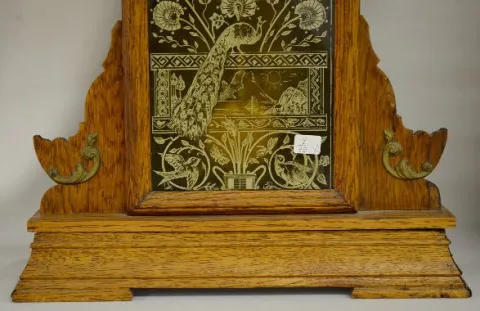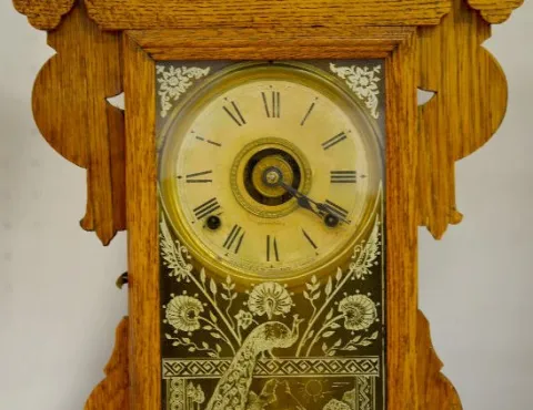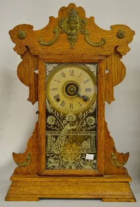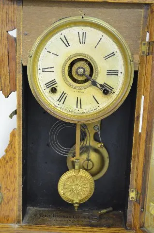 With a T&S with alarm movement; the dial is marked "Seth Thomas"; an interior label; a decorated glass door; and the pendulum. The clock is running an...