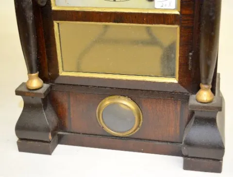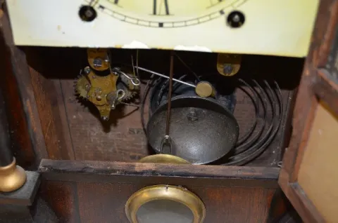 With a T&S and alarm movement and a painted metal dial. Ina case with 2 columns; an interior label and a pendulum peephole. The pendulum is with the c...